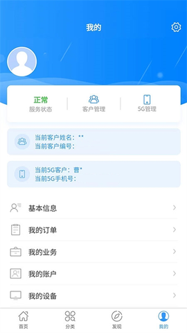 2. 应用涵盖了5G业务、宽带业务、终端产品及有线业务四大服务类型,并提供相关的便捷操作。